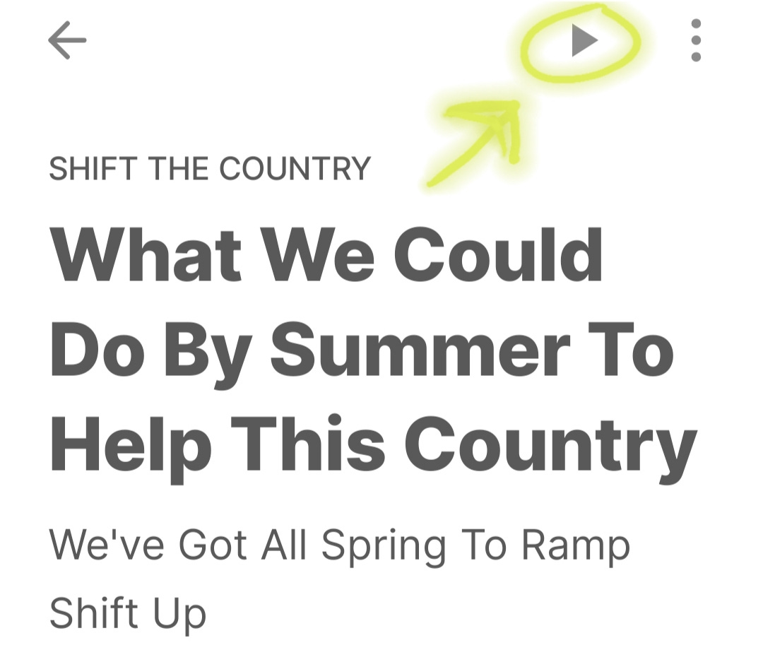I figured out today that Substack has an automated post-reading capability on its app. A screenshot is just above, with an arrow pointing to the “play” button on a recent post of ours in the app.